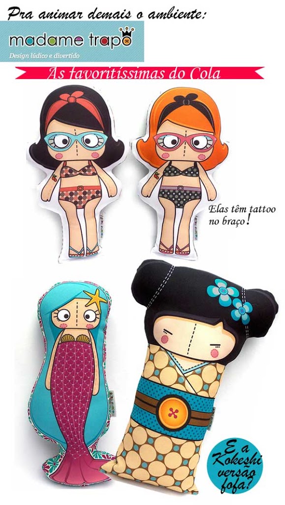 O Cola sempre foi fã demais da crafter Glá Quicoli da marca lúdica Madame Trapo, acho o estilo dos seus toys único e admirável! Afinal, misturam superbem a inocência dos brinquedos de pano e o “cool” e original do design contemporâneo. As peças têm sempre carinha de arte! Coisa de uma super designer mesmo! E não é que agora, a mocinha que já mandava bem nas ilustrações com agulha passou a imprimir sua arte em tecido? Resultado? Babe aí em cima! Esses são só alguns dos novos bonecos-almofadas! Seleção dos favoritíssimos do Cola. Glá os recomenda tanto para decorar o quarto de pequenos como para animar a sala dos grandinhos! Eu queria uma duplinha de Pin up e Gueixa pra ontem! :) Quer ver mais sobre a coleção? Vem aqui e divirta-se!