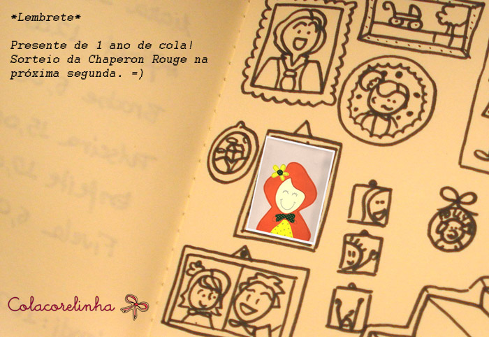 Amigas de blog queridas, o cola, agora com um ano e uma semaninha, lembra que até a próxima segunda, estão todas convidadas a se inscreverem no sorteio da Chaperon Rouge, quadrinho de colagem de papel e tecido. É só fazer um comentário neste post aqui. Boa sorte! (Agradeço a participação daqueles que já se inscreveram. Feliz!)