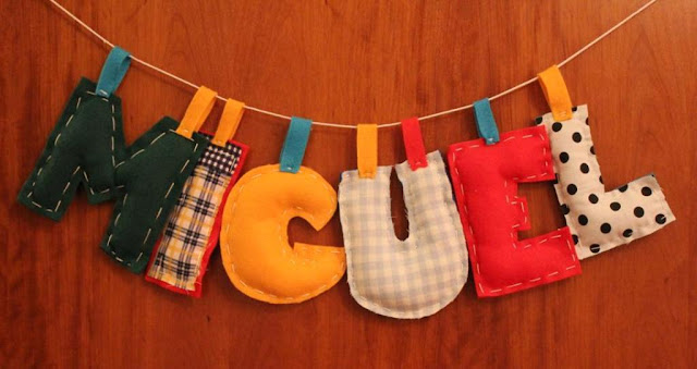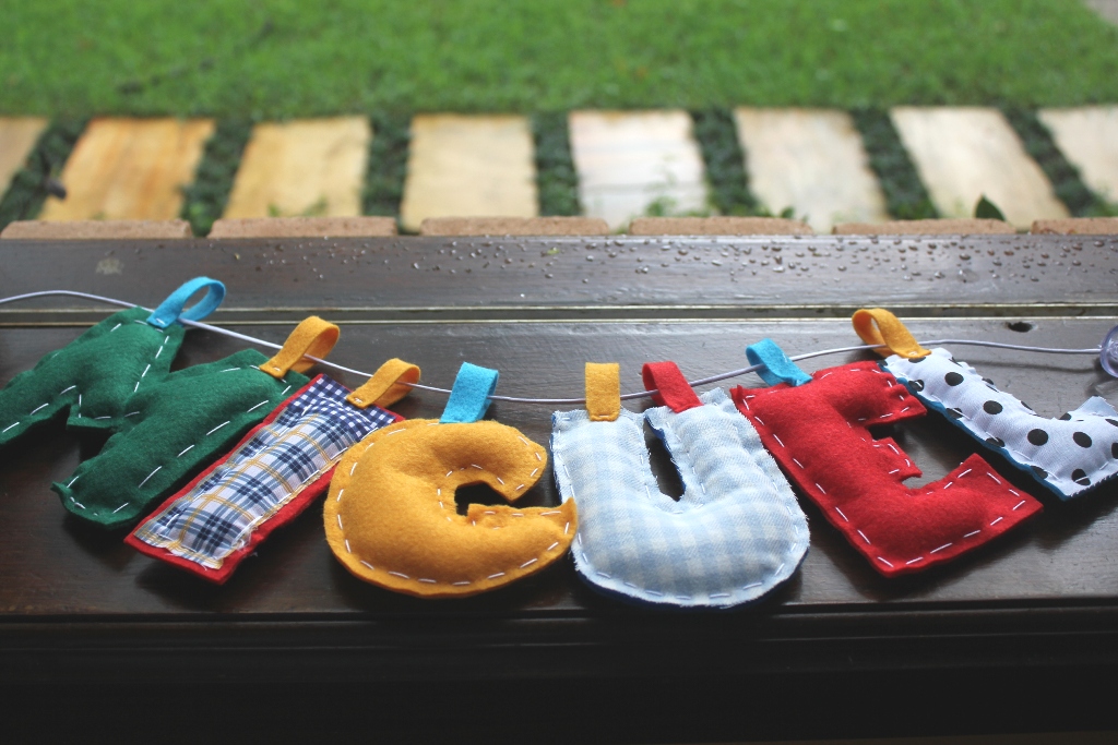 Viva! Ontem dormi toda contente! Afinal, consegui cumprir a tarefa: primeiro enfeite de porta do cola realizado! =) De manhã, comprei os tecidos, escolhi xadrez fofos em flanela e feltros bem vibrantes… Aí, durante o italiano macarrônico da noite, as letrinhas foram surgindo (cada uma tem uns 12cm)! E o especial Miguel, que chegará no fim de janeiro, começou a aparecer! Para o enchimento, usei algodão orgânico! Tem uma textura bem diferente da manta, é supernatural e bem macio. O enfeite vai para a porta da maternidade, mas depois, a ideia é decorar o quartinho junto com móbiles na cortina e bastidores que chegam ao cola já já! Estão em produção. Até domingo, precisam chegar à mamãe do Miguel! Eba! Deu certo e grudam direitinho! Espero que tenham gostado!