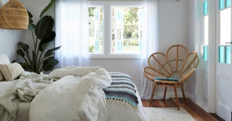 Neste ambiente, podemos ver várias inspirações da decor wabi-sabi como uso do tapete e cesto de sisal, os lençóis em camadas, tons terrosos e a mistura de materiais como a madeira, cobre, cimento.